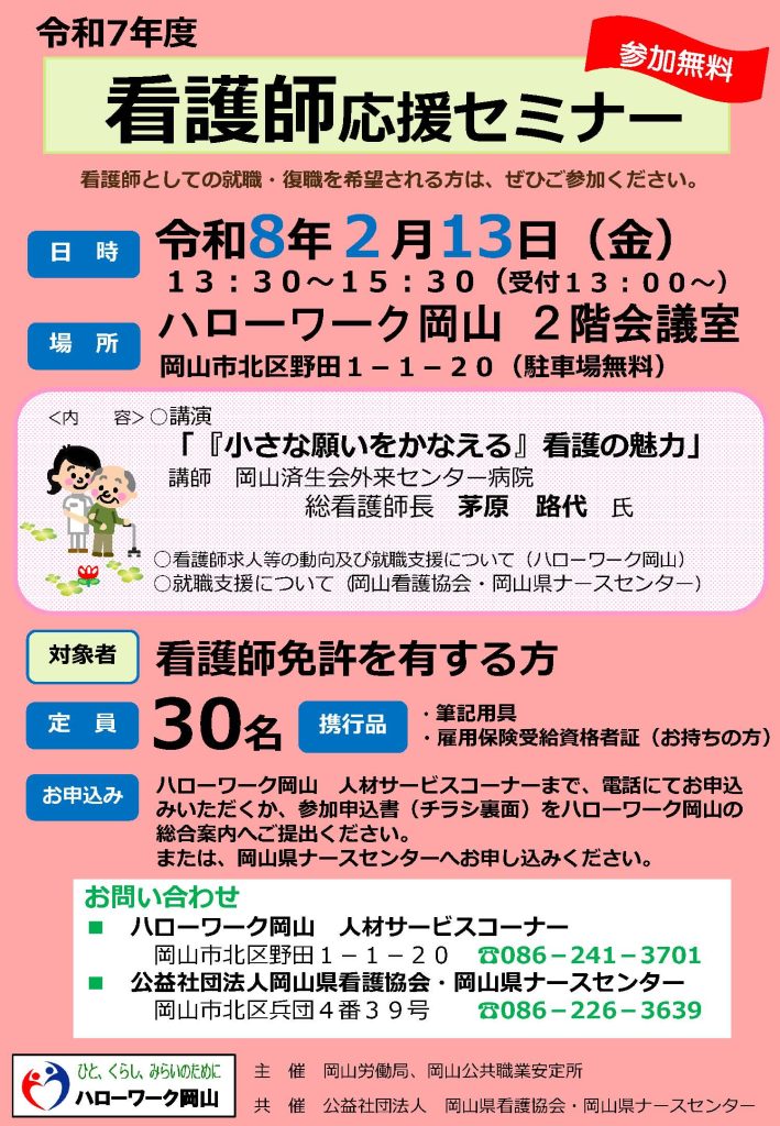 【ハローワーク岡山】2月13日看護師応援セミナー開催のご案内