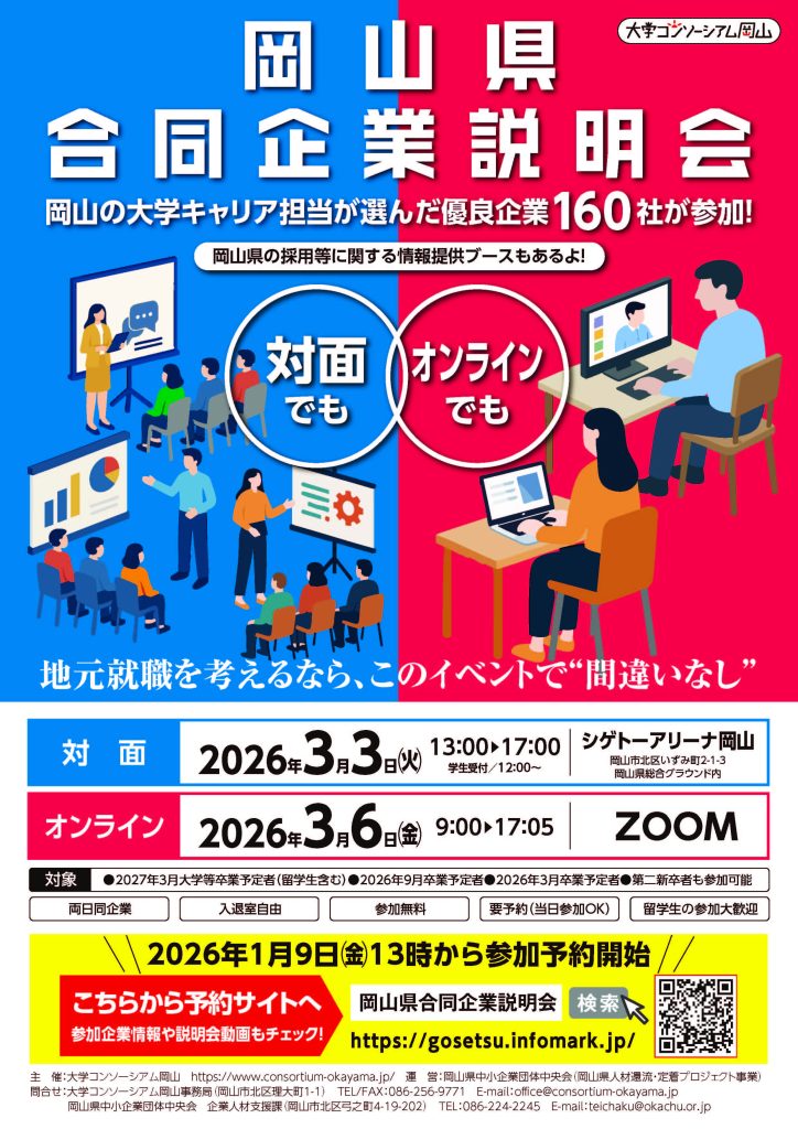 大学コンソーシアム岡山の主催により、2027年3月卒業予定者等を対象とした『岡山県合同企業説明会』が開催されます。